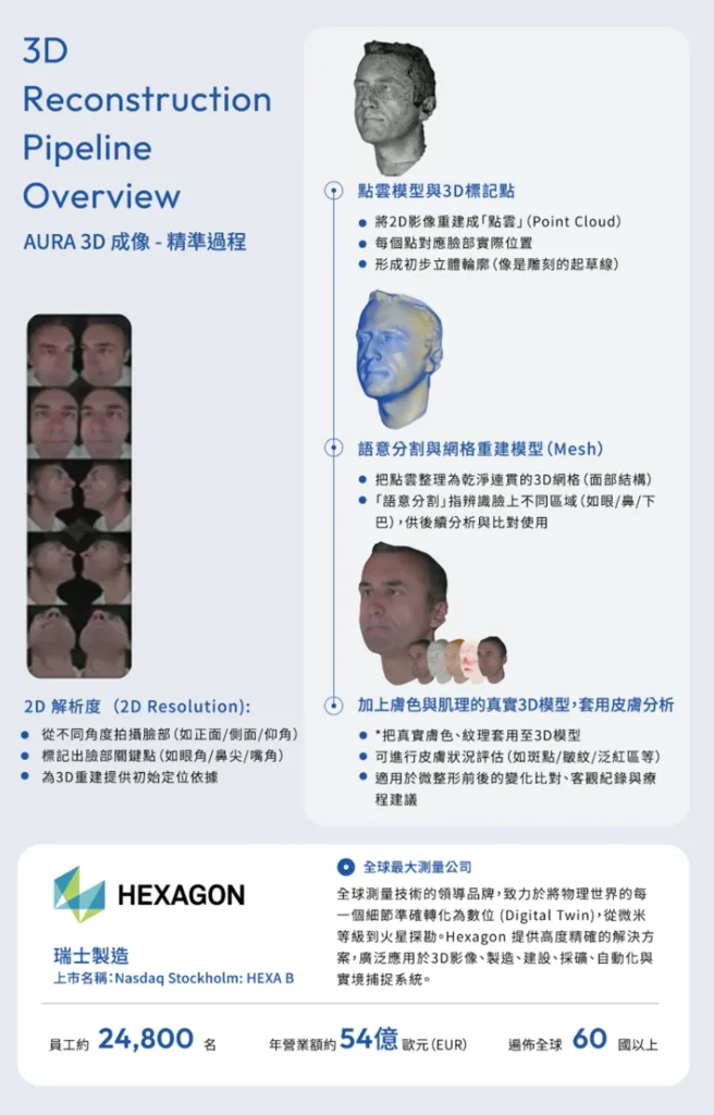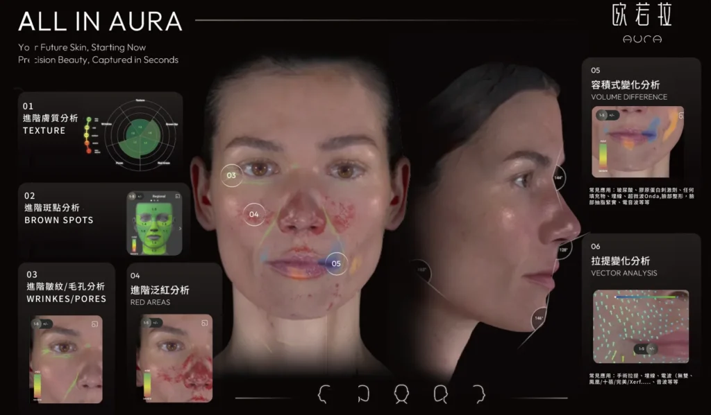 系統可分析皺紋、毛孔、膚色不均、紅腫、斑點、膚質紋理等,並量測臉部比例與體積變化,提供完整報告,讓醫師看得更細、計畫更精準。