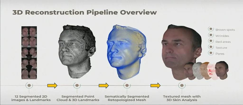 Immersive 3D visualisations offer a comprehensive analysis of a patient’s skin, including wrinkles, pores, red areas, brown spots, texture and scoring.