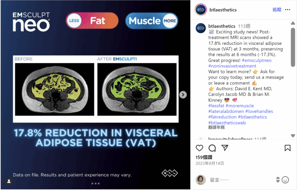 是的,EMSCULPT NEO熱磁減脂對於內臟脂肪(Visceral Adipose Tissue, VAT)的代謝確實有正面幫助,並已有國際實證研究佐證。根據NEO原廠@btlaesthetics的Instagram貼文,美國臨床團隊David E. Kent、Carolyn Jacob、Brian M. Kinney等醫師以MRI實際檢測,發現受試者接受EMSCULPT NEO療程後,三個月內平均減少17.8%內臟脂肪,半年後仍維持近17.3%的成果。此數據已經國際醫學會公開發表,代表熱磁減脂不只改善外觀曲線,對健康風險也具明顯功效。